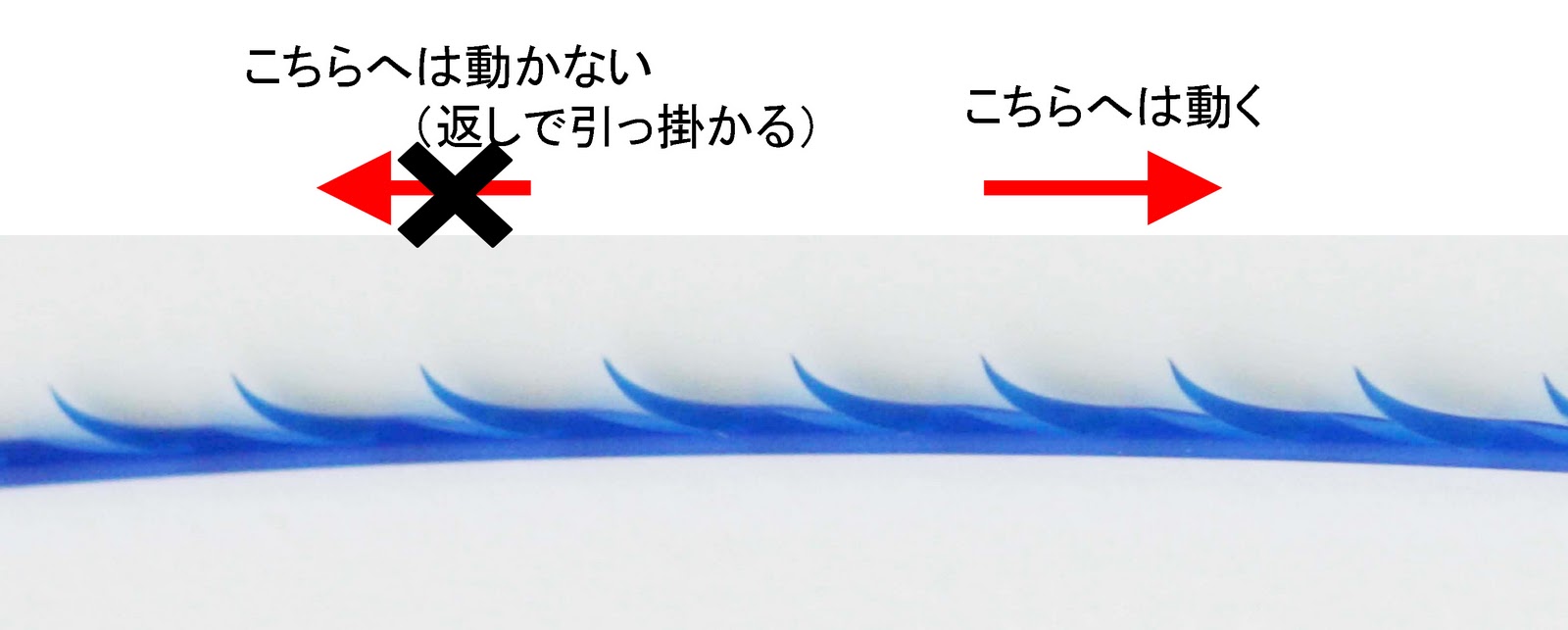 この「返し」によって、糸を頬に入れると、下図のように、一方向には動くけれども、反対方向には動きません。